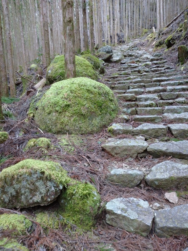 今回は、新宮から熊野川をバスでさかのぼり、翌日小口から那智大社まで約8時間の歩きでした。道中、人は少なく、苔むした石段を敷き詰めた杉落ち葉を踏みながら、越前峠を登る静かな古道歩きを楽しめました。