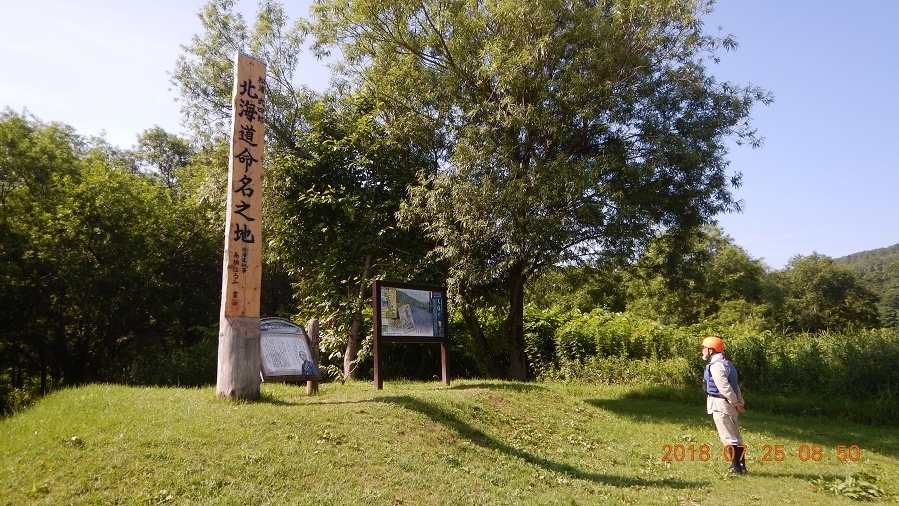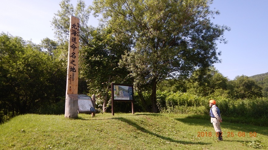 ③初日の夕方と翌朝の2回、天塩川温泉の先の音威子府にある幕末の探検家松浦武四郎の「北海道命名之地」碑を訪れました。蛭川さんは松浦武四郎の大ファンでこの碑を訪れるのを楽しみにしていました。