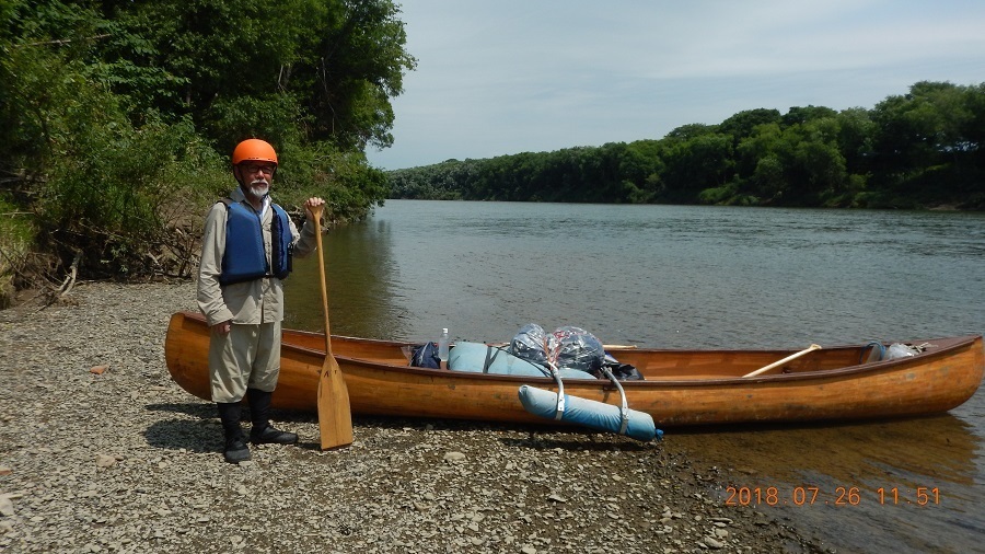 前半は7月13~15日(沈2回)、後半は7月16~18日、前半の経験を生かして沈0で無事漕行しました。二人艇の後部に私が座り舵取りと主推進漕ぎ、蛭川さんは前部に座り真面目に?漕がれました。普段は饒舌な蛭川さんが口数少なかったですが、「川の上にいる時の自由の感覚、開放感を陸にいる人間に説明するのは難しい。この目前にある自然や時間はすべて我々だけのものであった。―野田知佑―(注2)」を実感してカヌー川下りを楽しまれたと思います。
