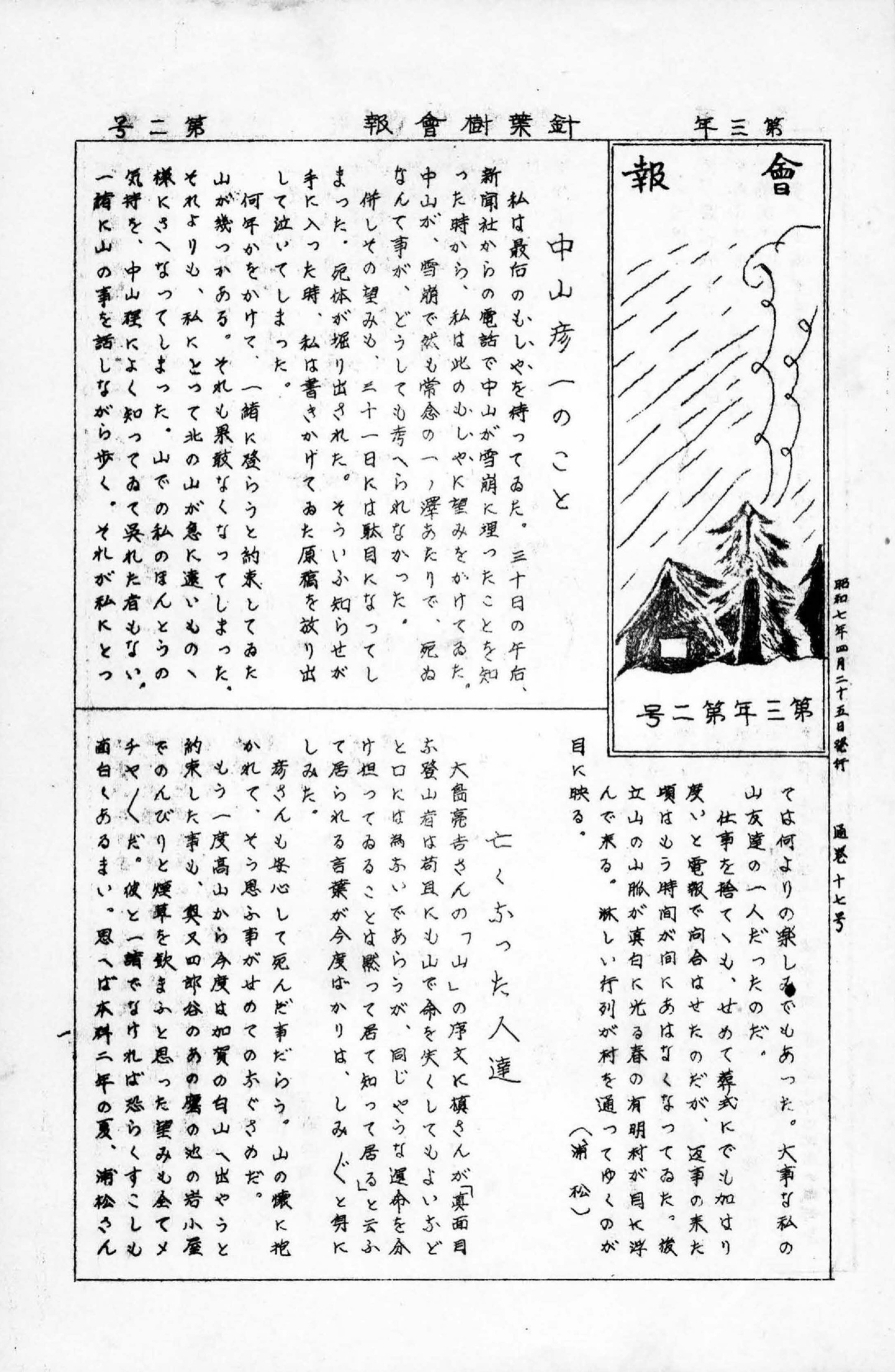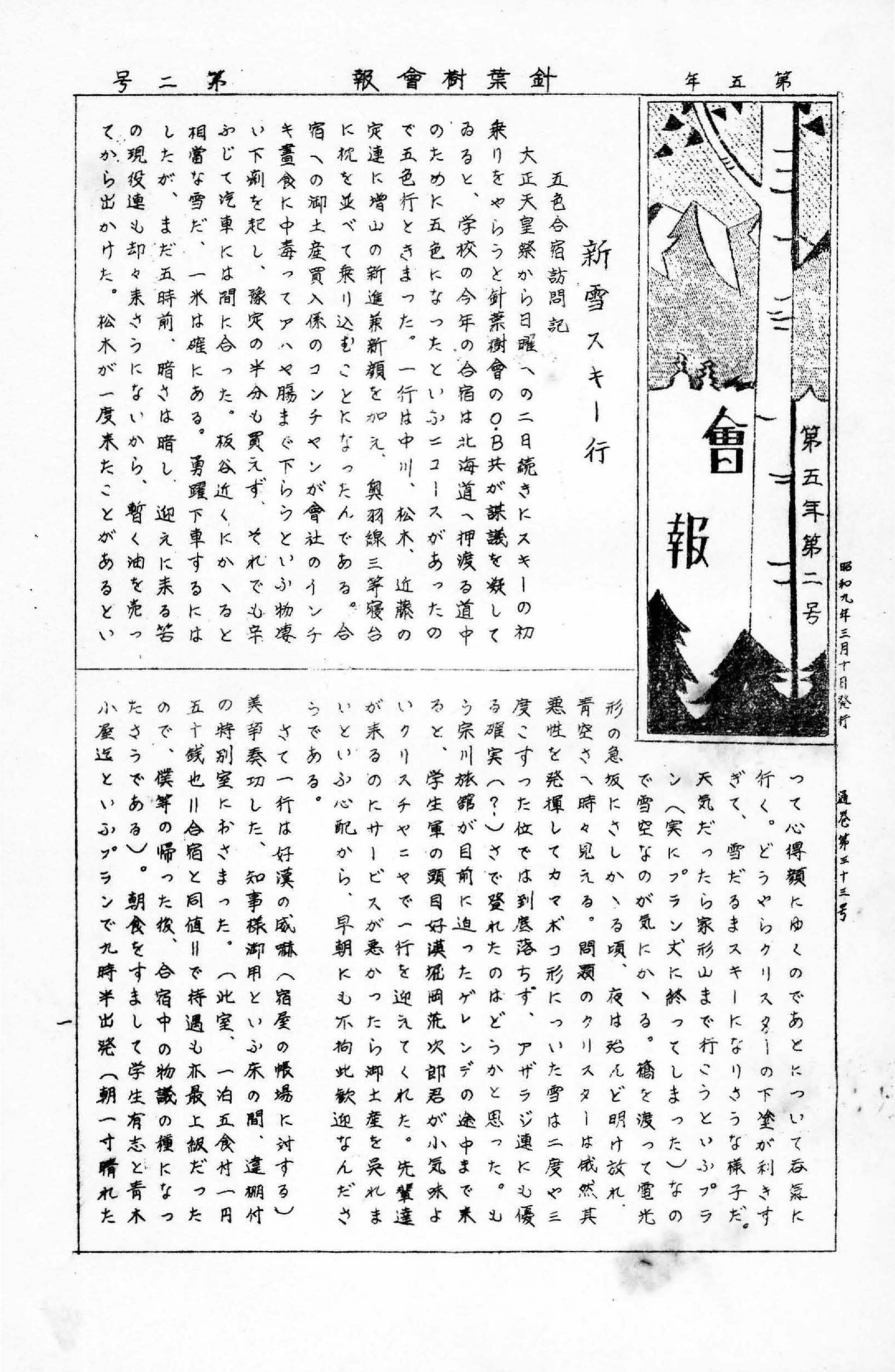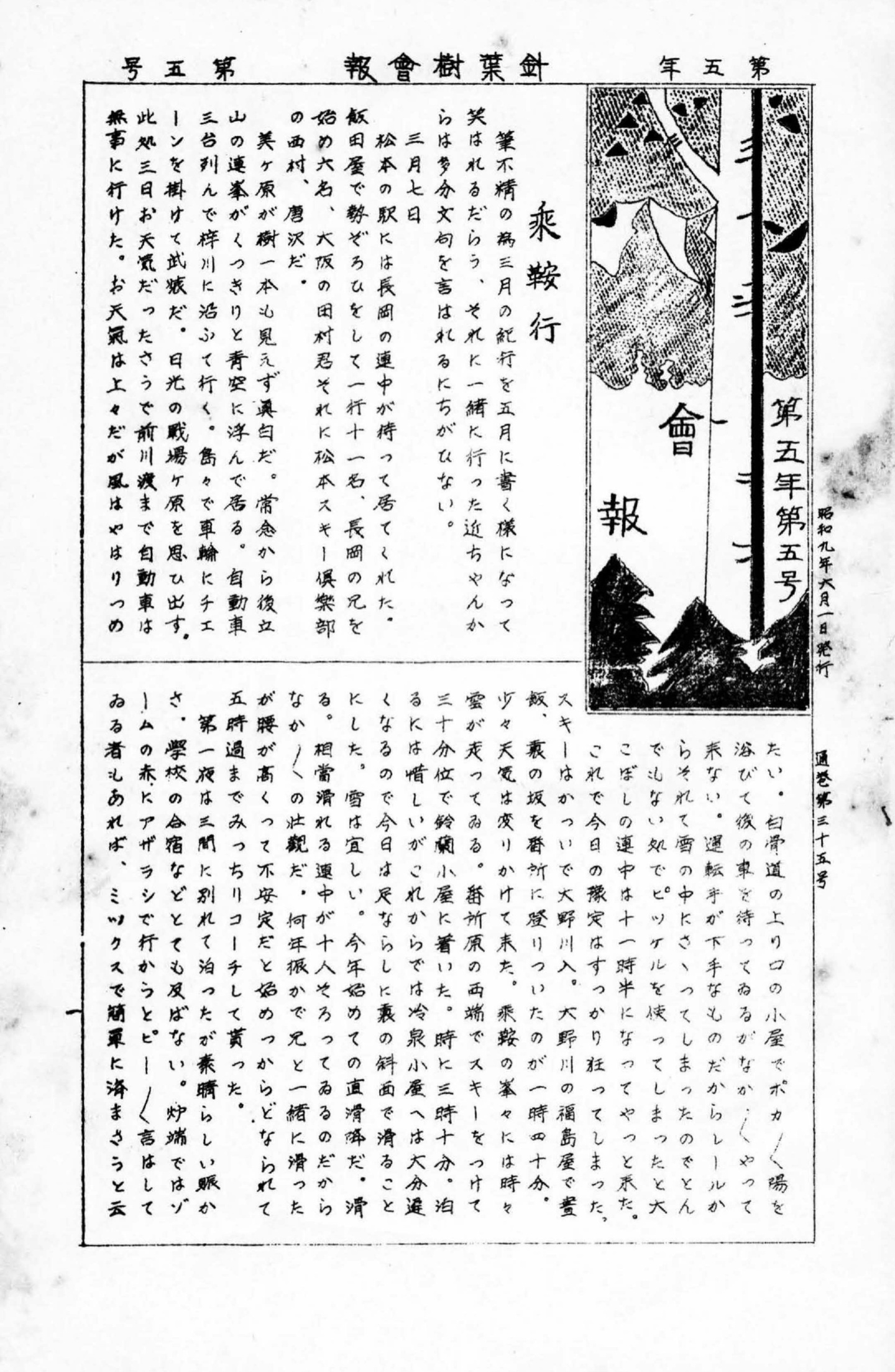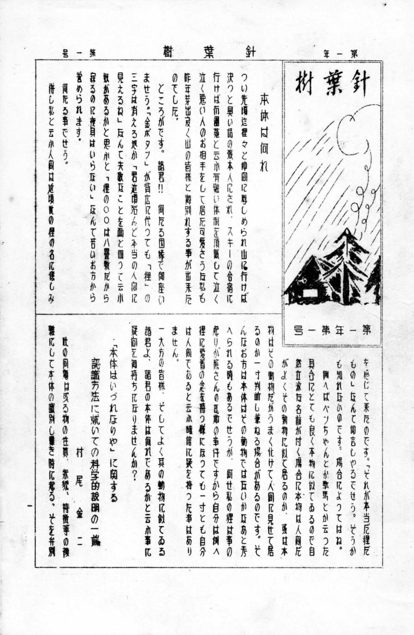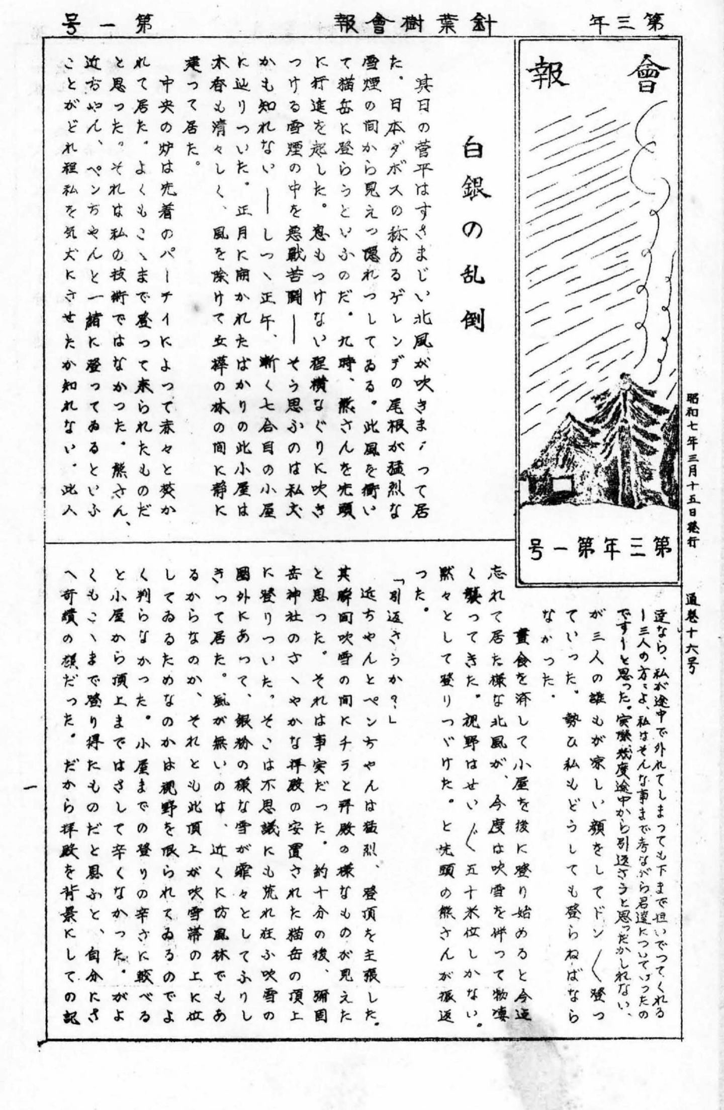 (前略)針葉樹会報がある。これは第1号を昭和5年に出している。つまり私達の グループが卒業して2年目から発行を始めていることになる。この頃は一橋山岳部と針葉樹会を切り離し、学校の山岳部員だった者が社会に出ると、自動的にOBグループの針葉樹会員になるということであったらしい。