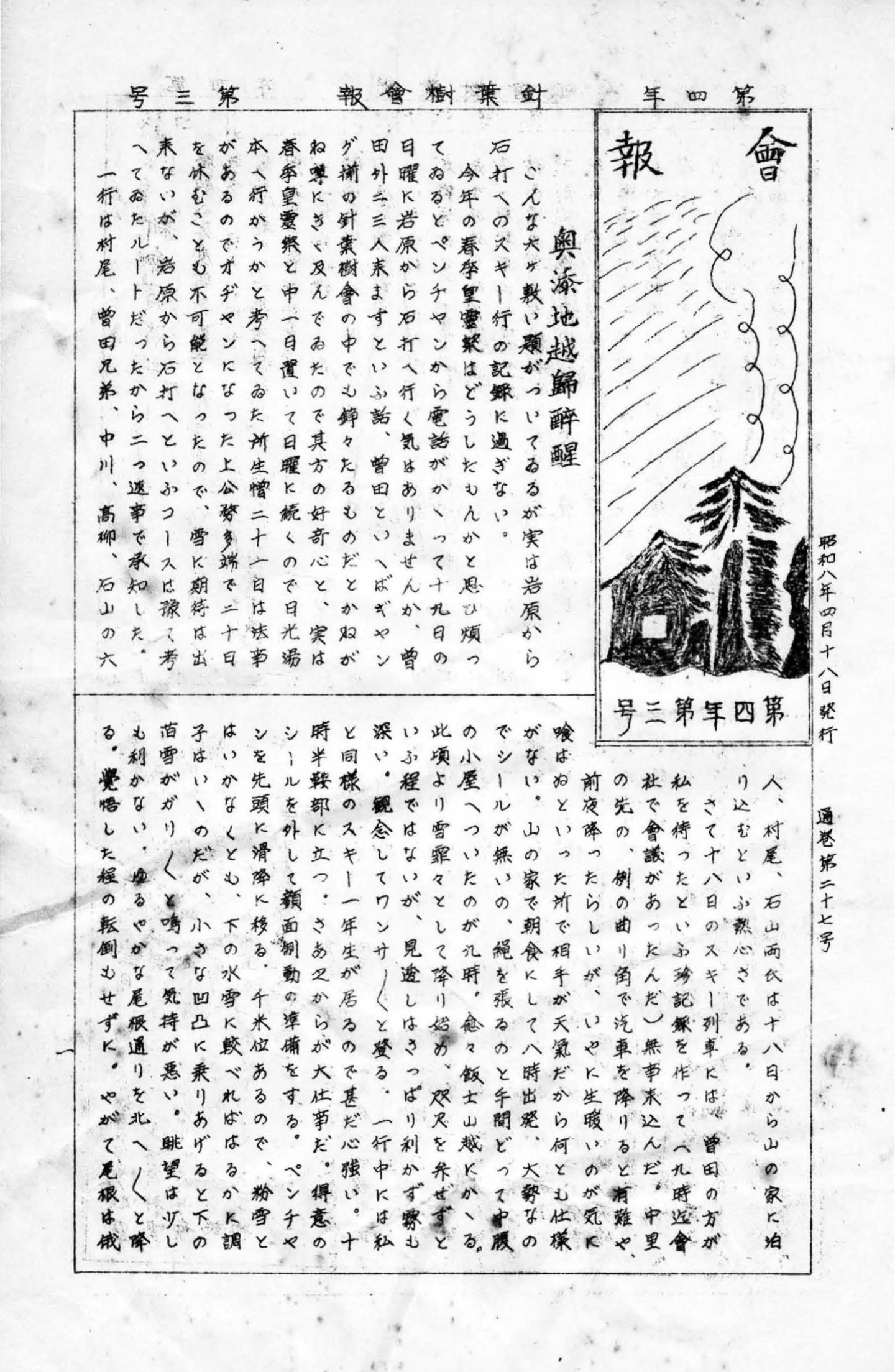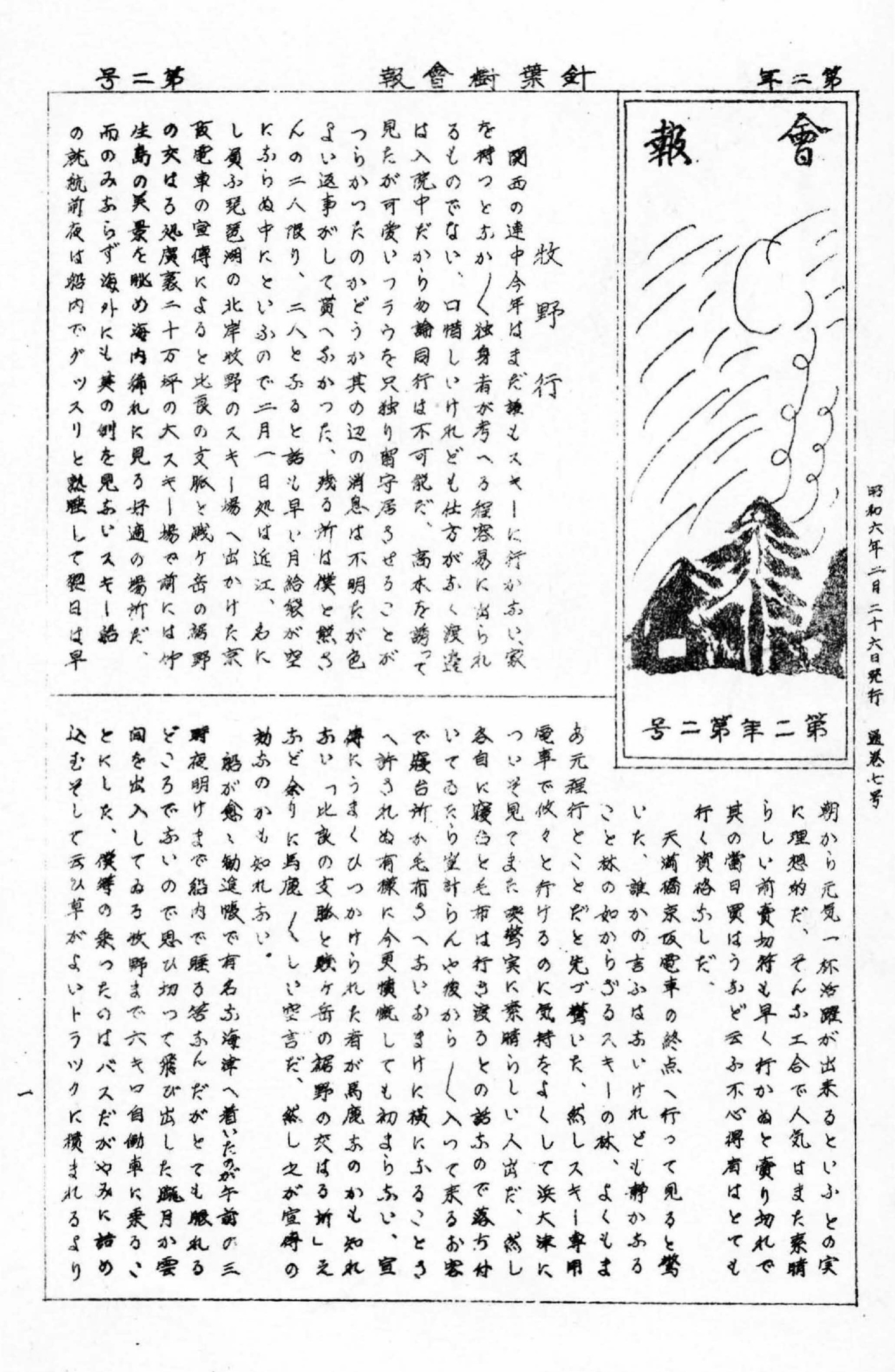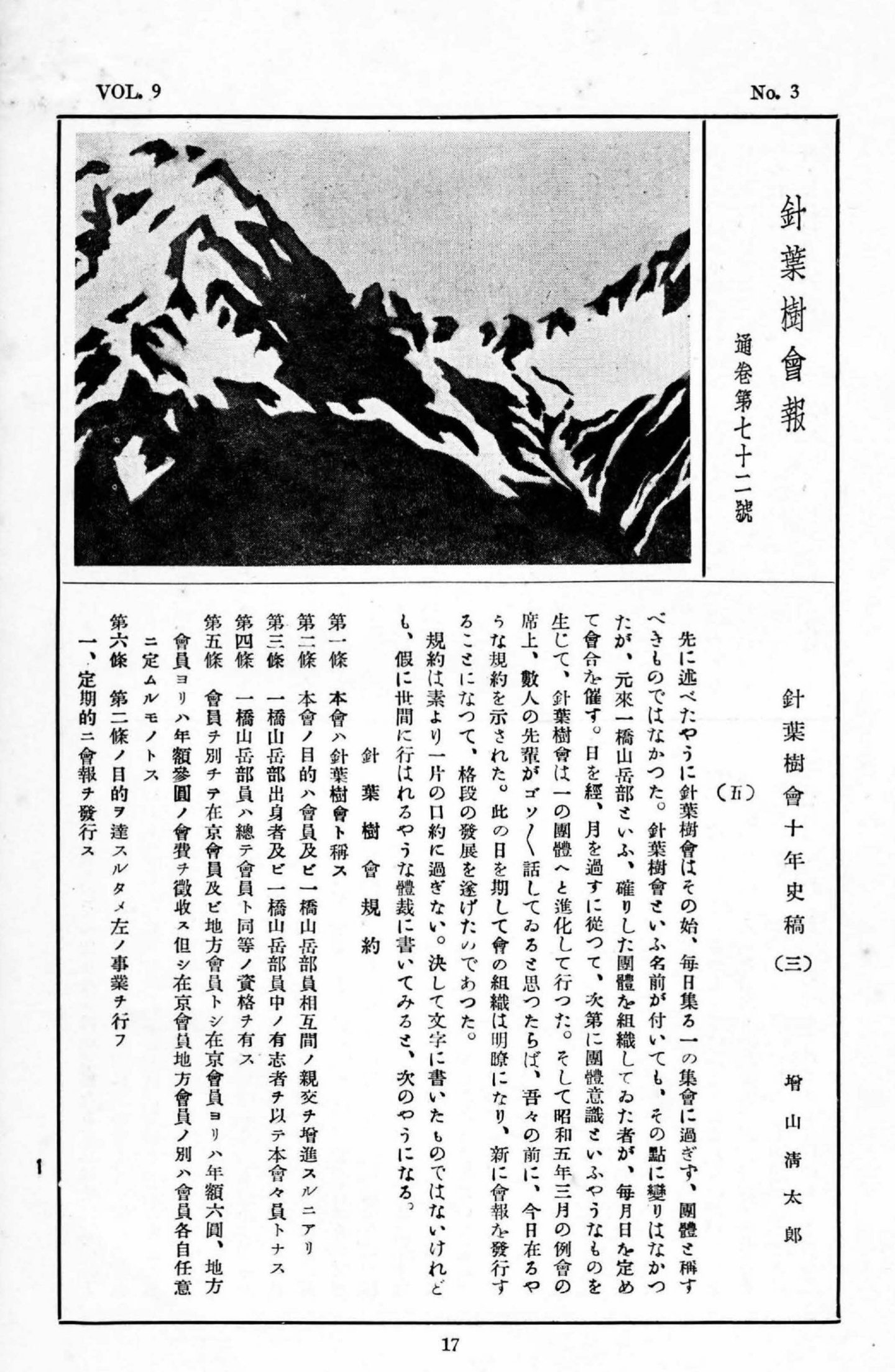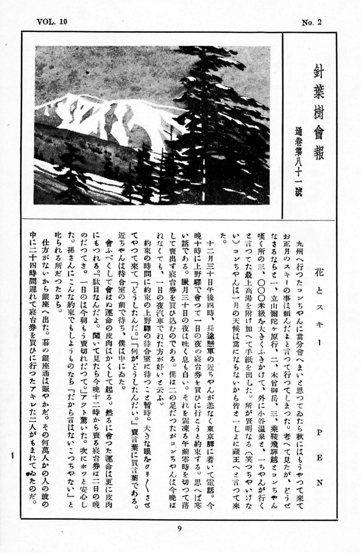 (前略)針葉樹会報がある。これは第1号を昭和5年に出している。つまり私達の グループが卒業して2年目から発行を始めていることになる。この頃は一橋山岳部と針葉樹会を切り離し、学校の山岳部員だった者が社会に出ると、自動的にOBグループの針葉樹会員になるということであったらしい。