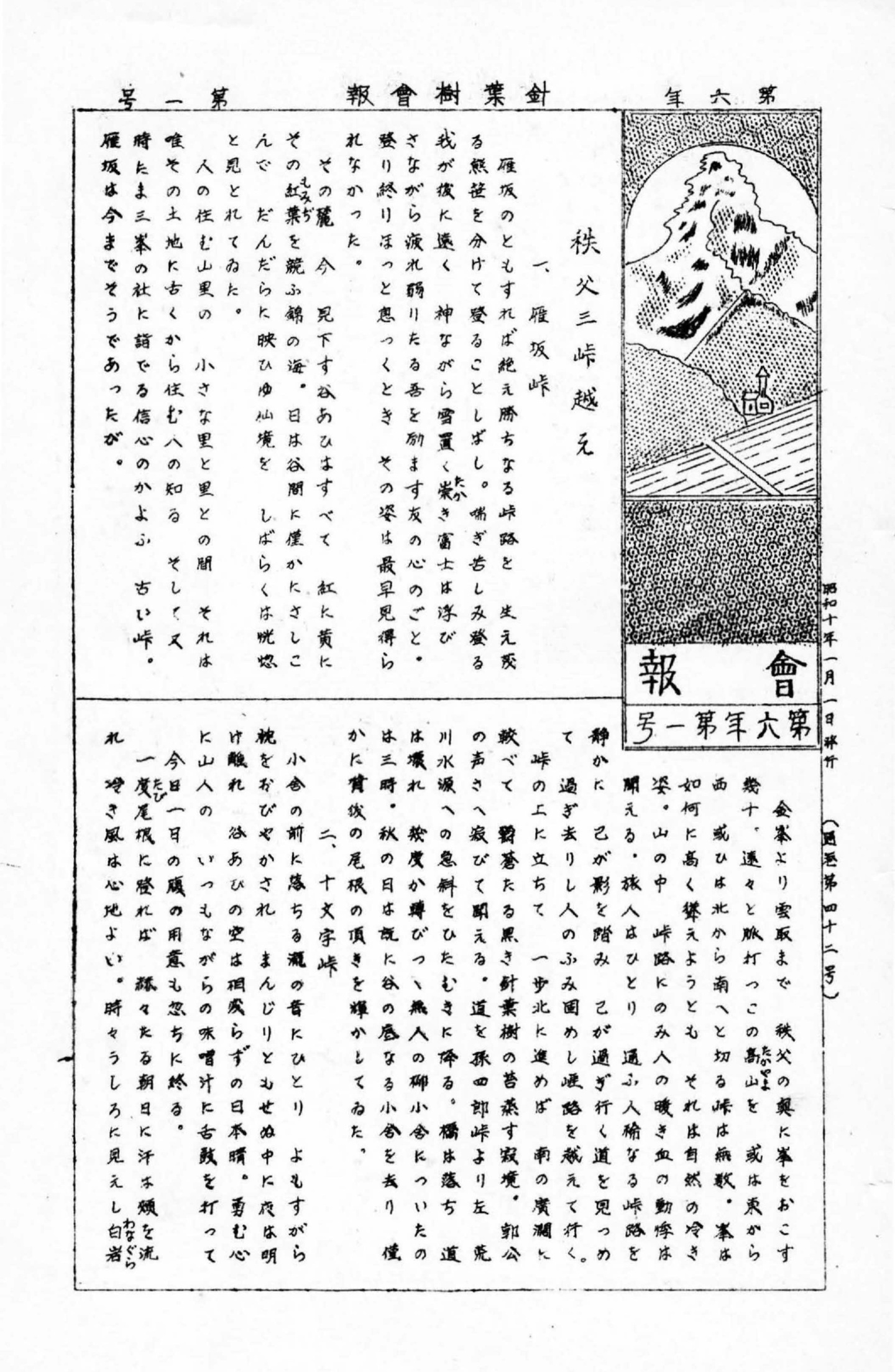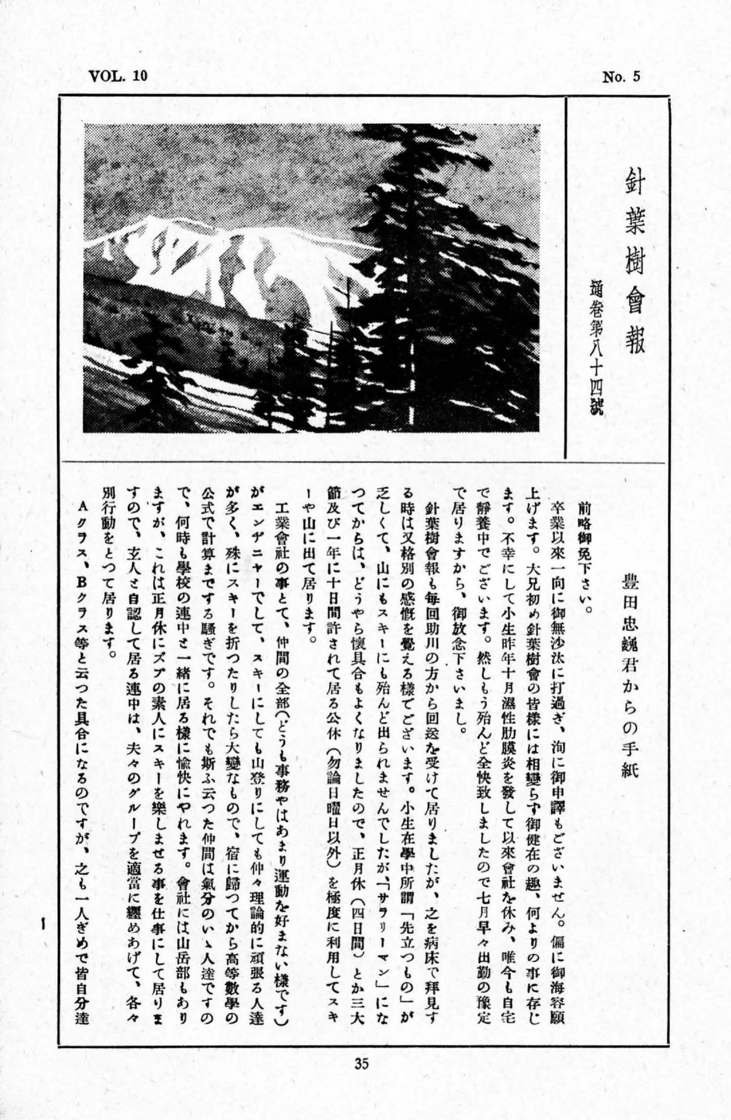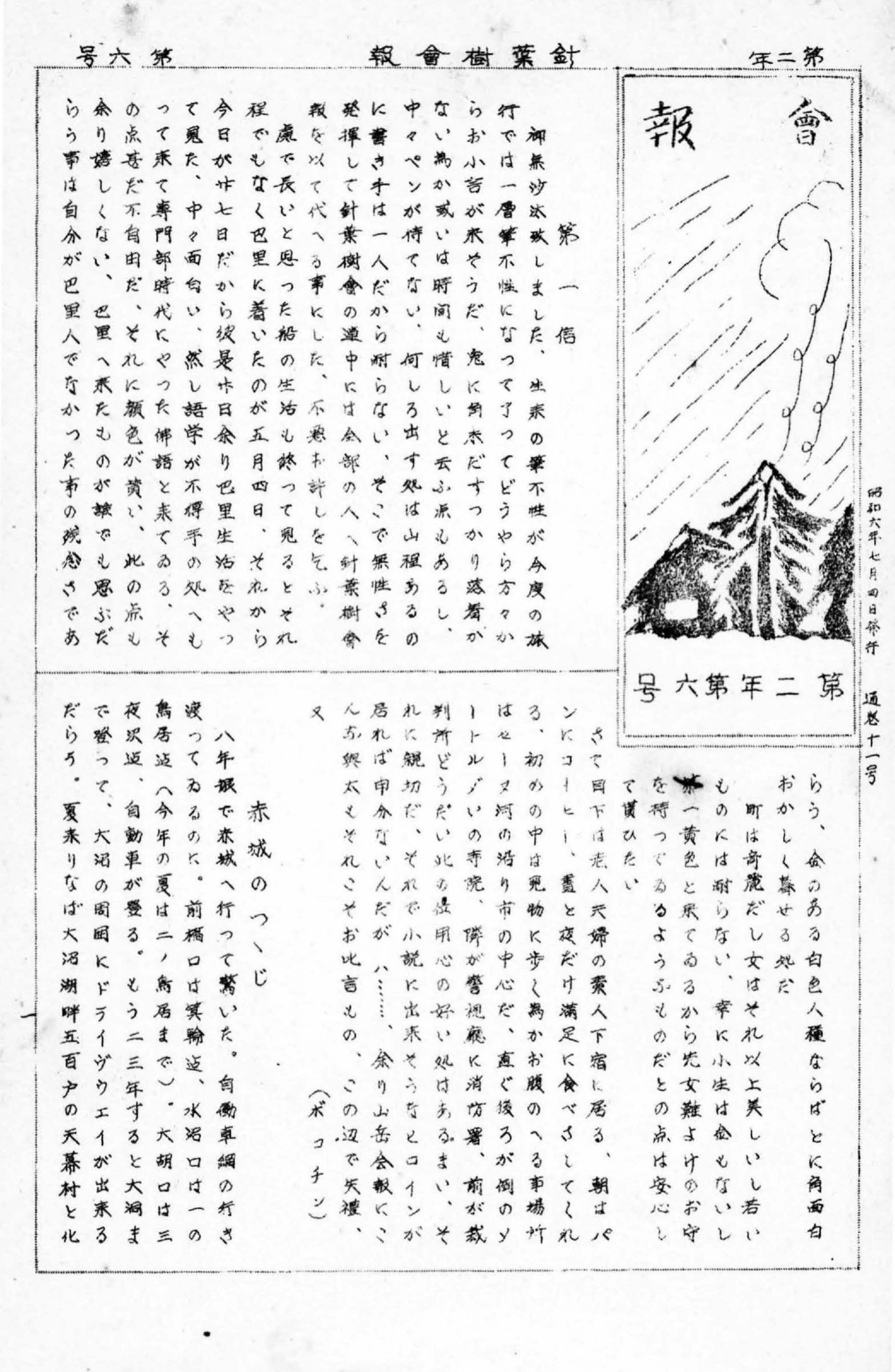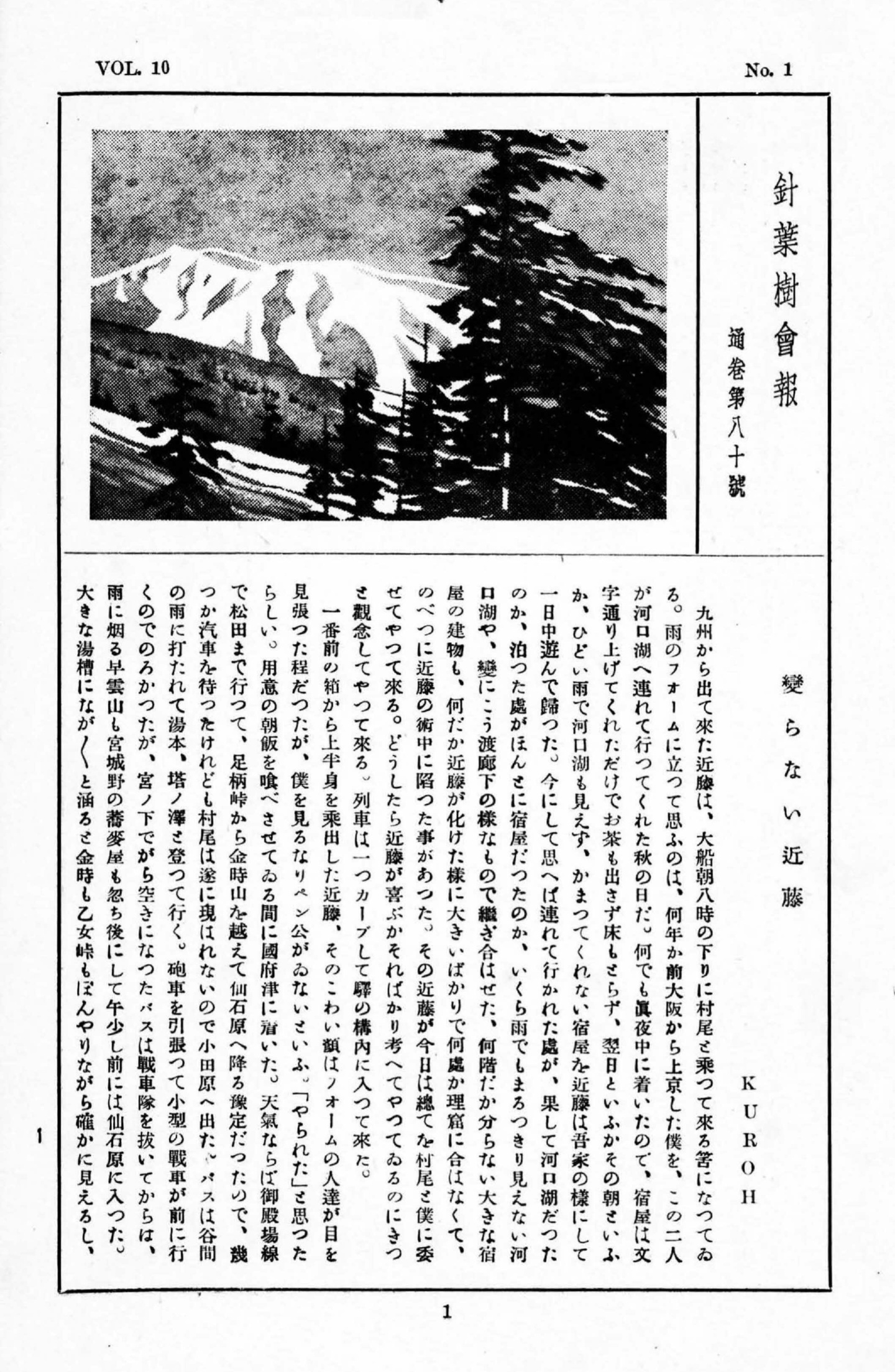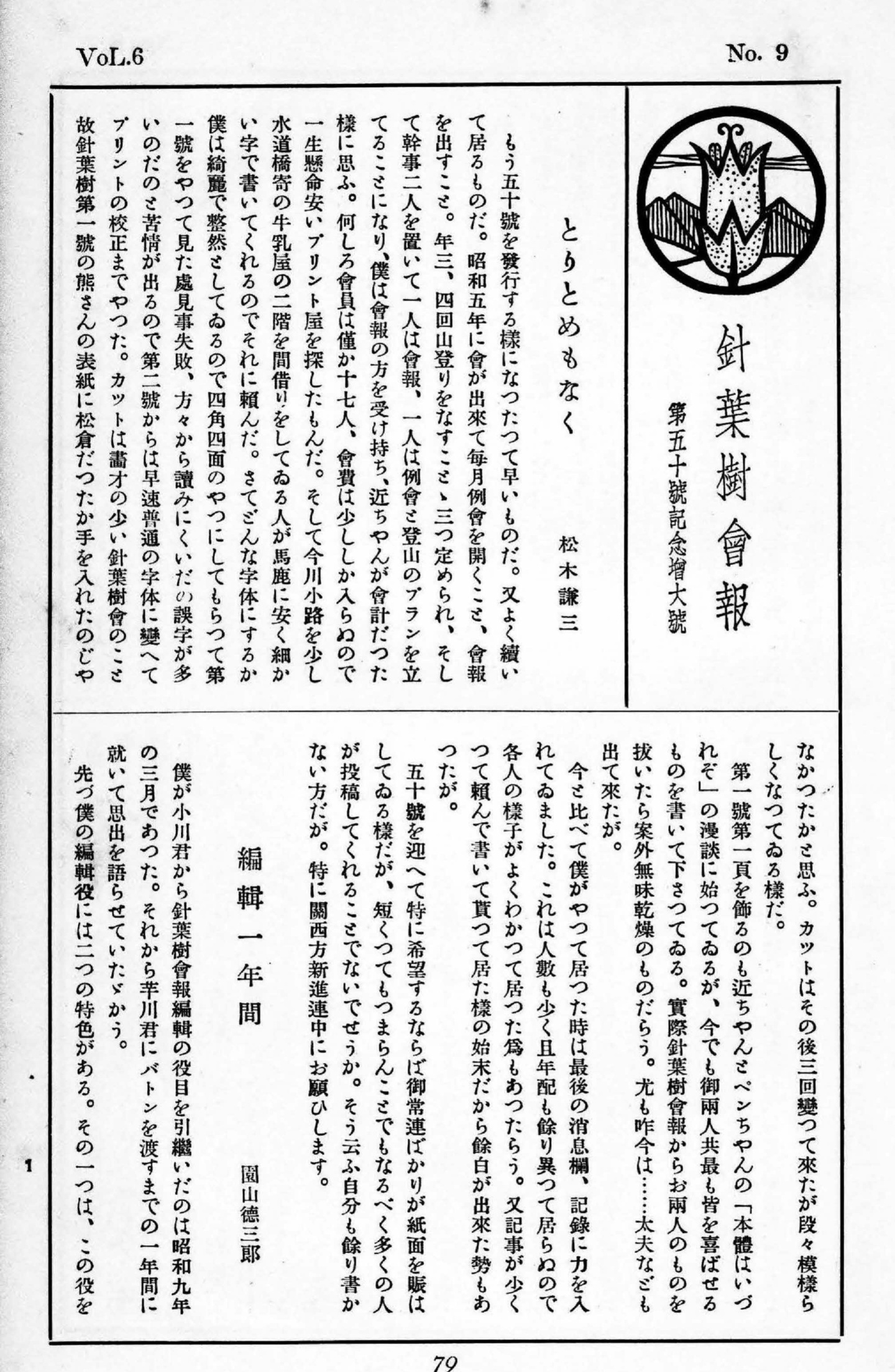 (前略)針葉樹会報がある。これは第1号を昭和5年に出している。つまり私達の グループが卒業して2年目から発行を始めていることになる。この頃は一橋山岳部と針葉樹会を切り離し、学校の山岳部員だった者が社会に出ると、自動的にOBグループの針葉樹会員になるということであったらしい。