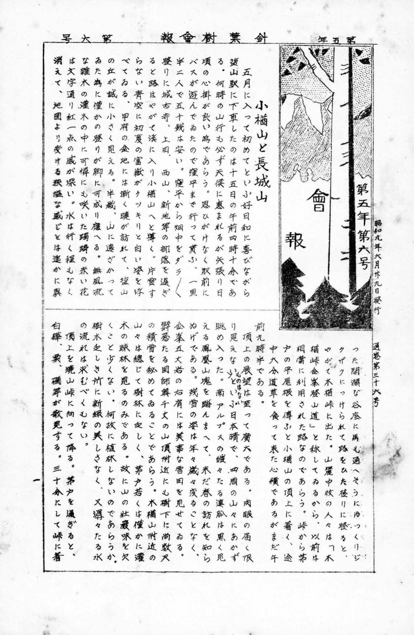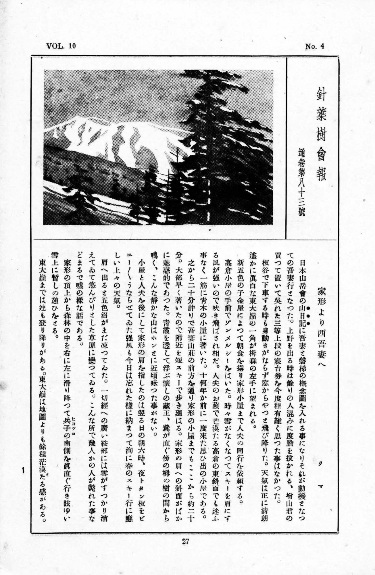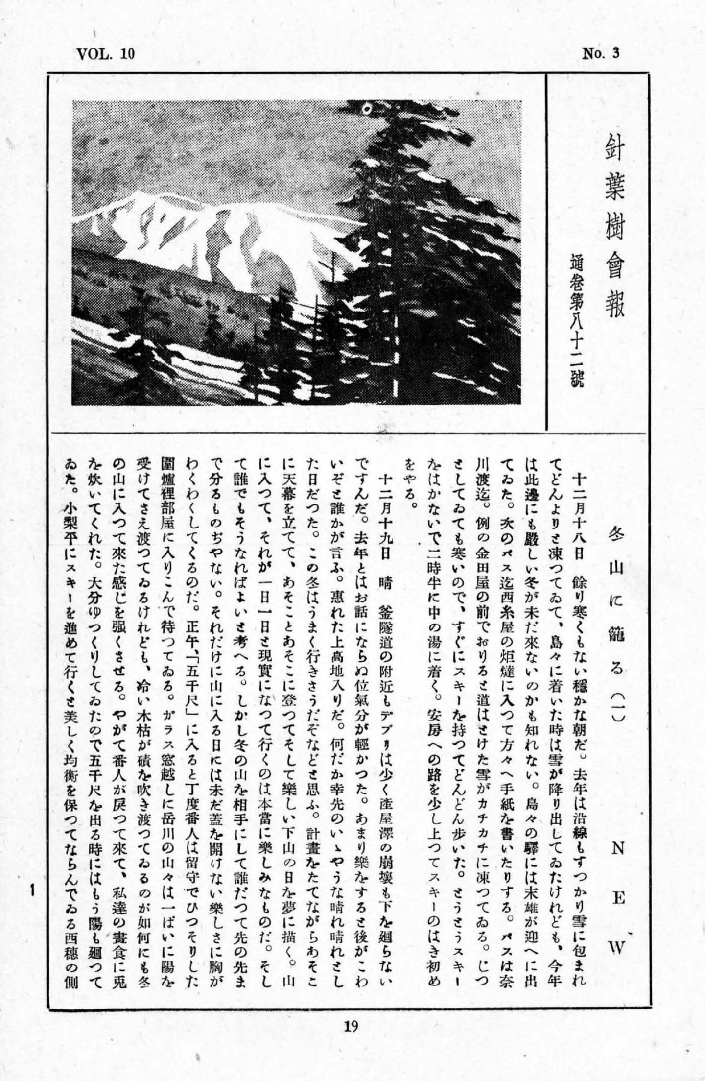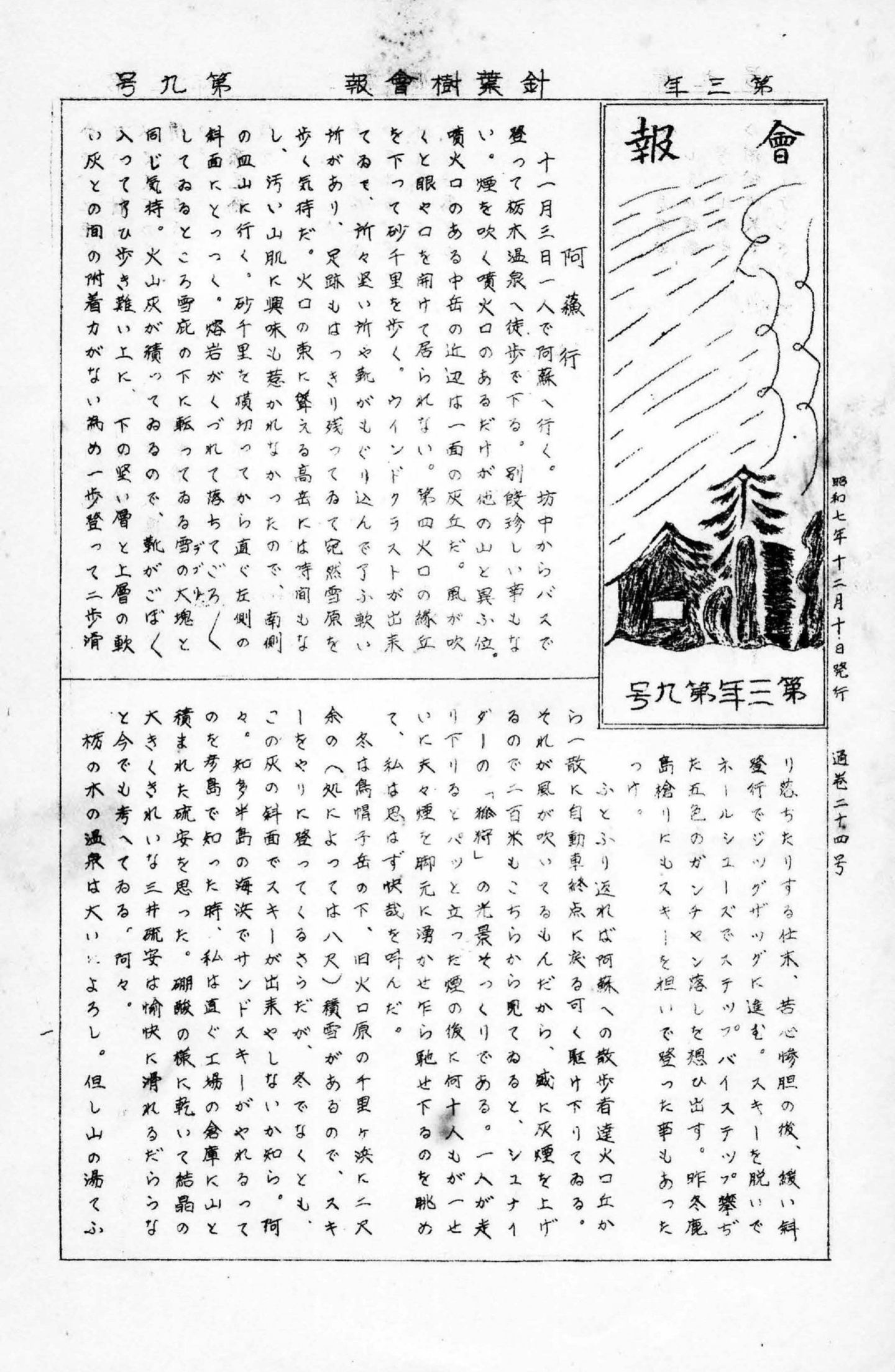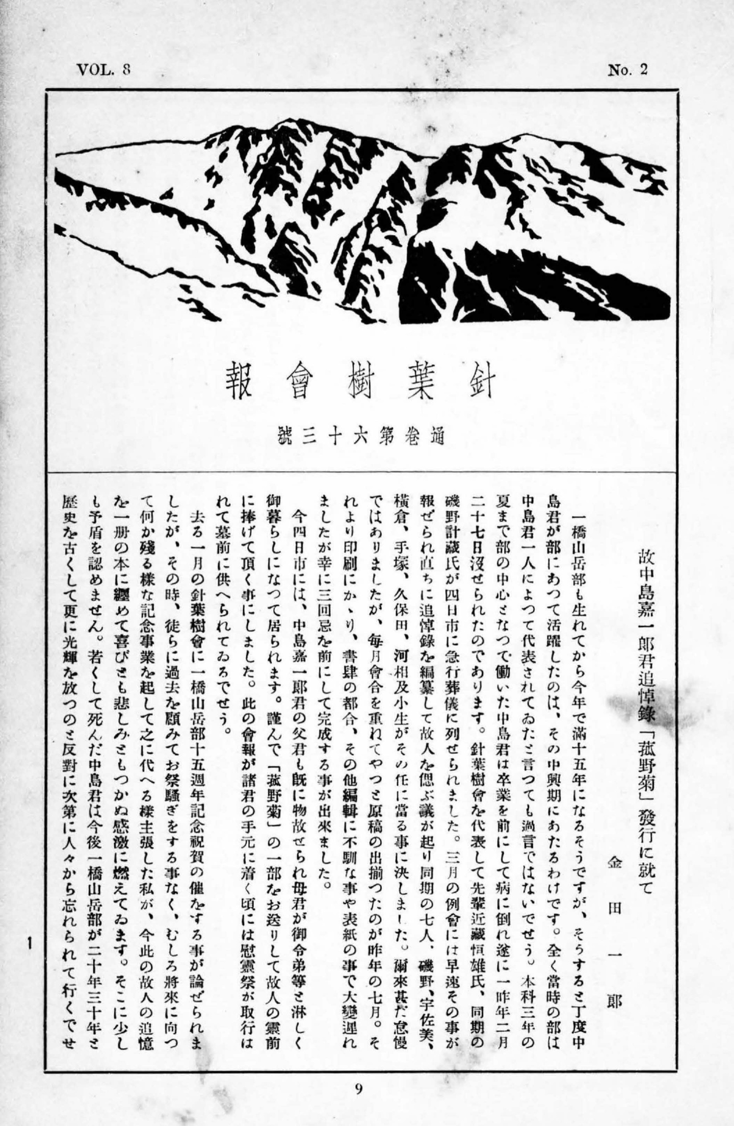 (前略)針葉樹会報がある。これは第1号を昭和5年に出している。つまり私達の グループが卒業して2年目から発行を始めていることになる。この頃は一橋山岳部と針葉樹会を切り離し、学校の山岳部員だった者が社会に出ると、自動的にOBグループの針葉樹会員になるということであったらしい。