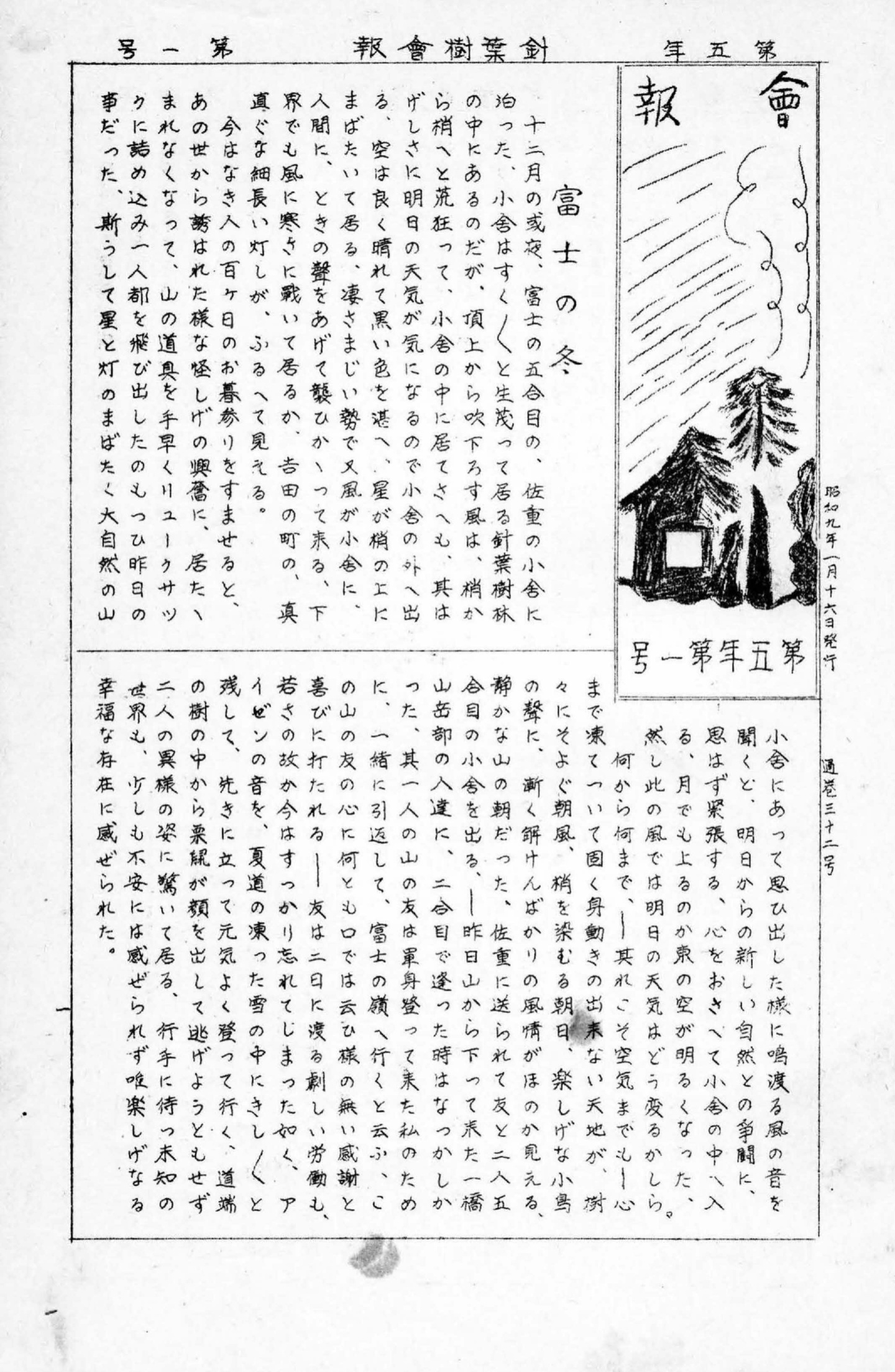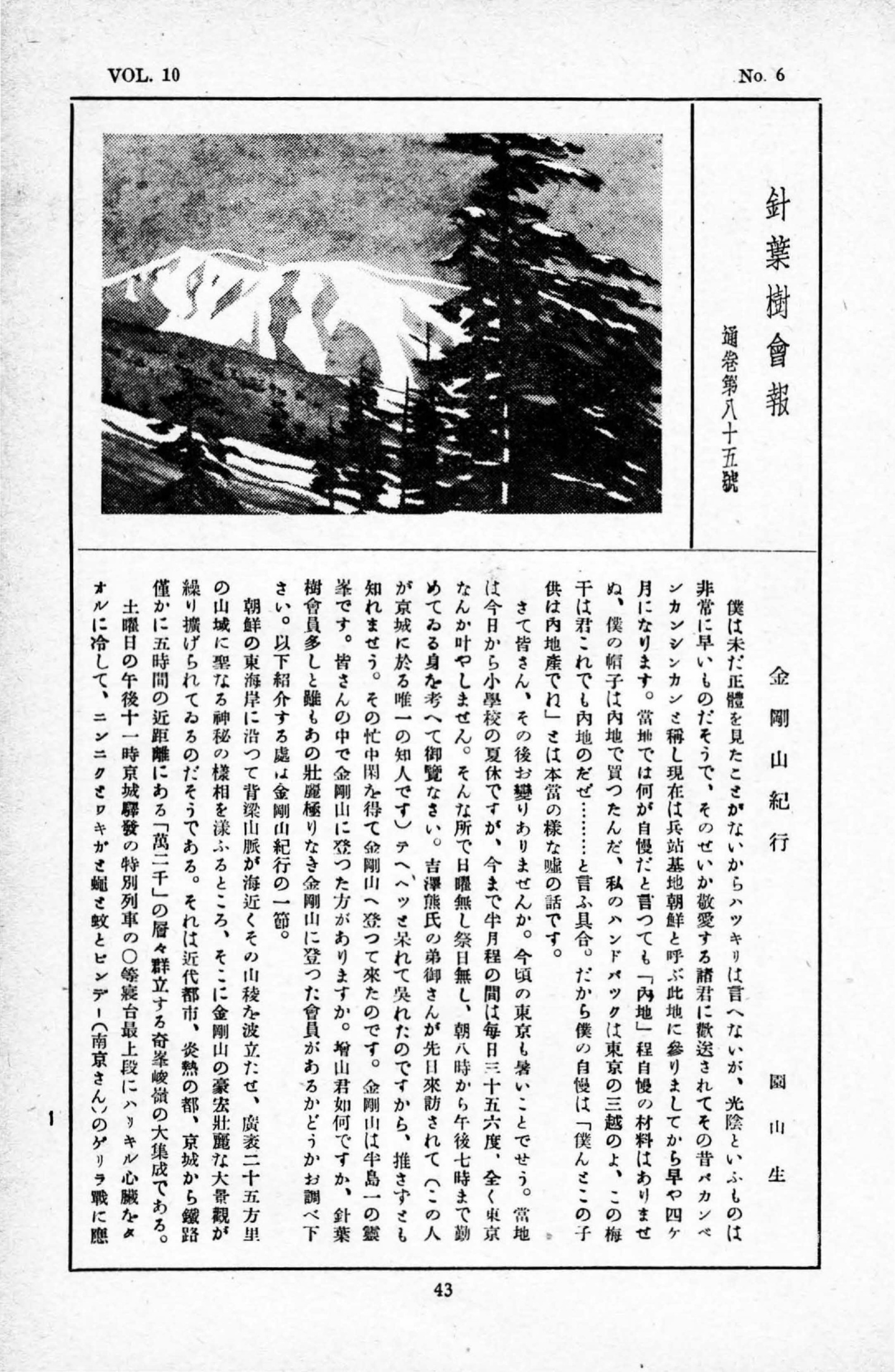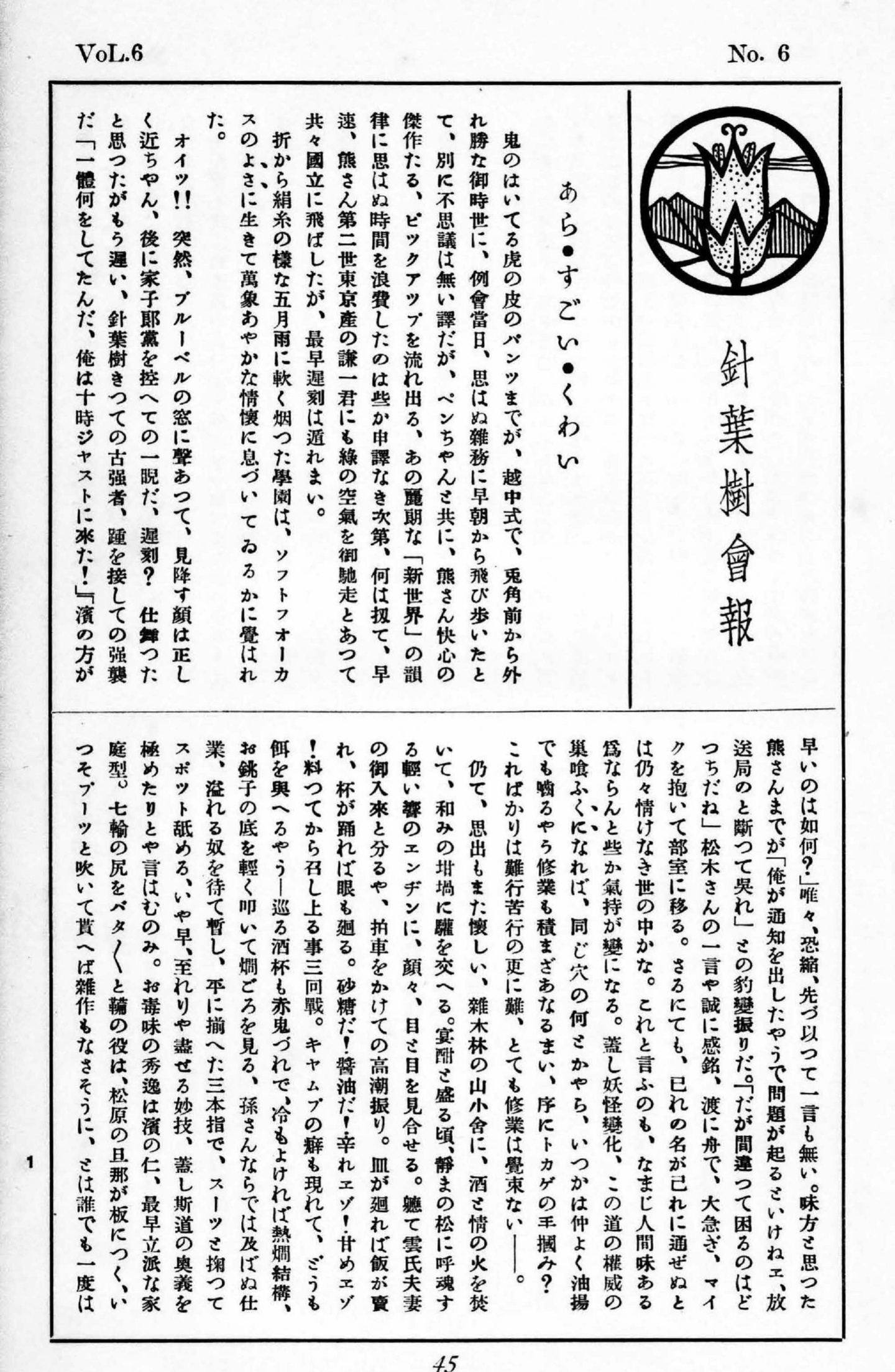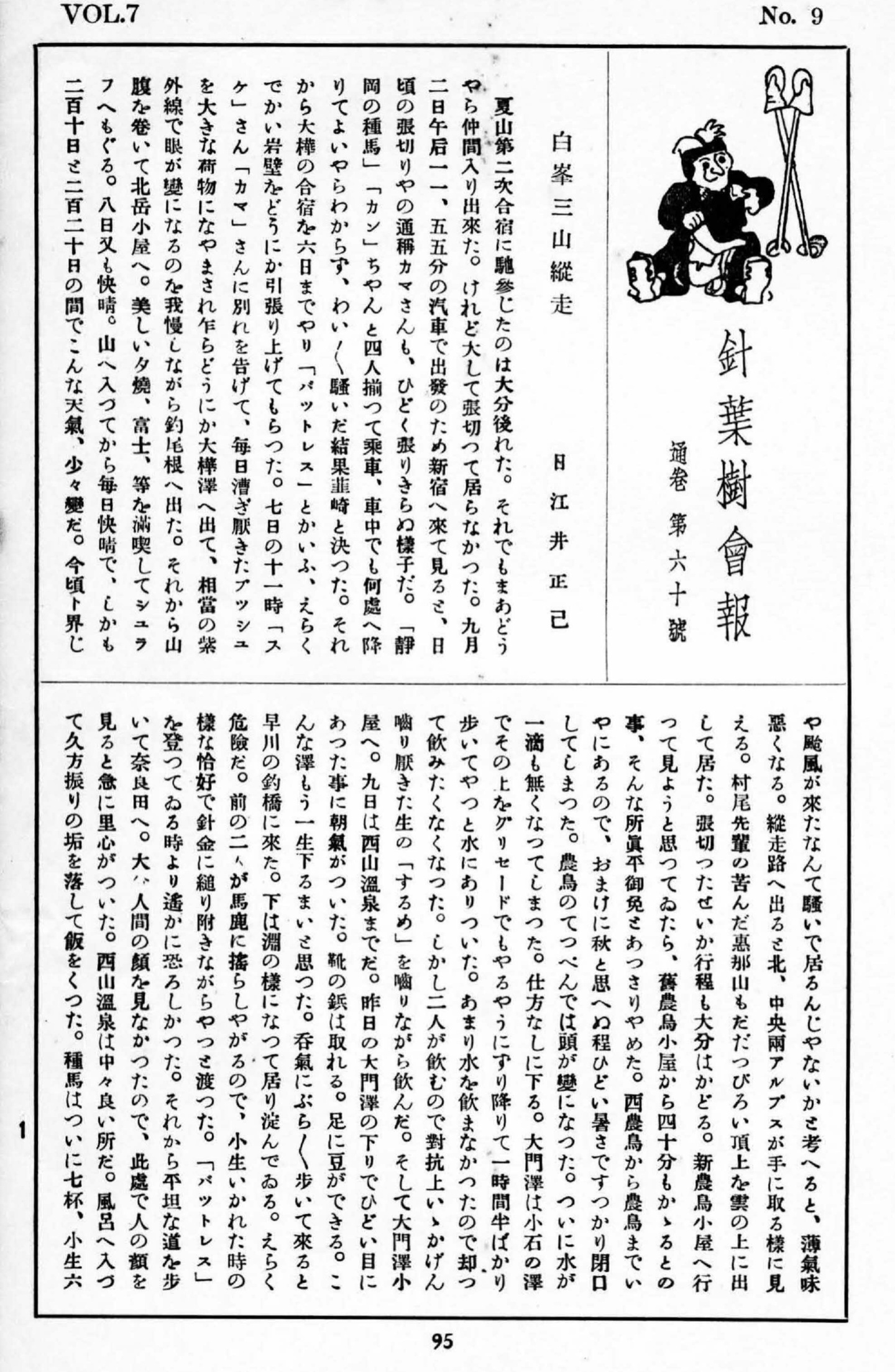 (前略)針葉樹会報がある。これは第1号を昭和5年に出している。つまり私達の グループが卒業して2年目から発行を始めていることになる。この頃は一橋山岳部と針葉樹会を切り離し、学校の山岳部員だった者が社会に出ると、自動的にOBグループの針葉樹会員になるということであったらしい。