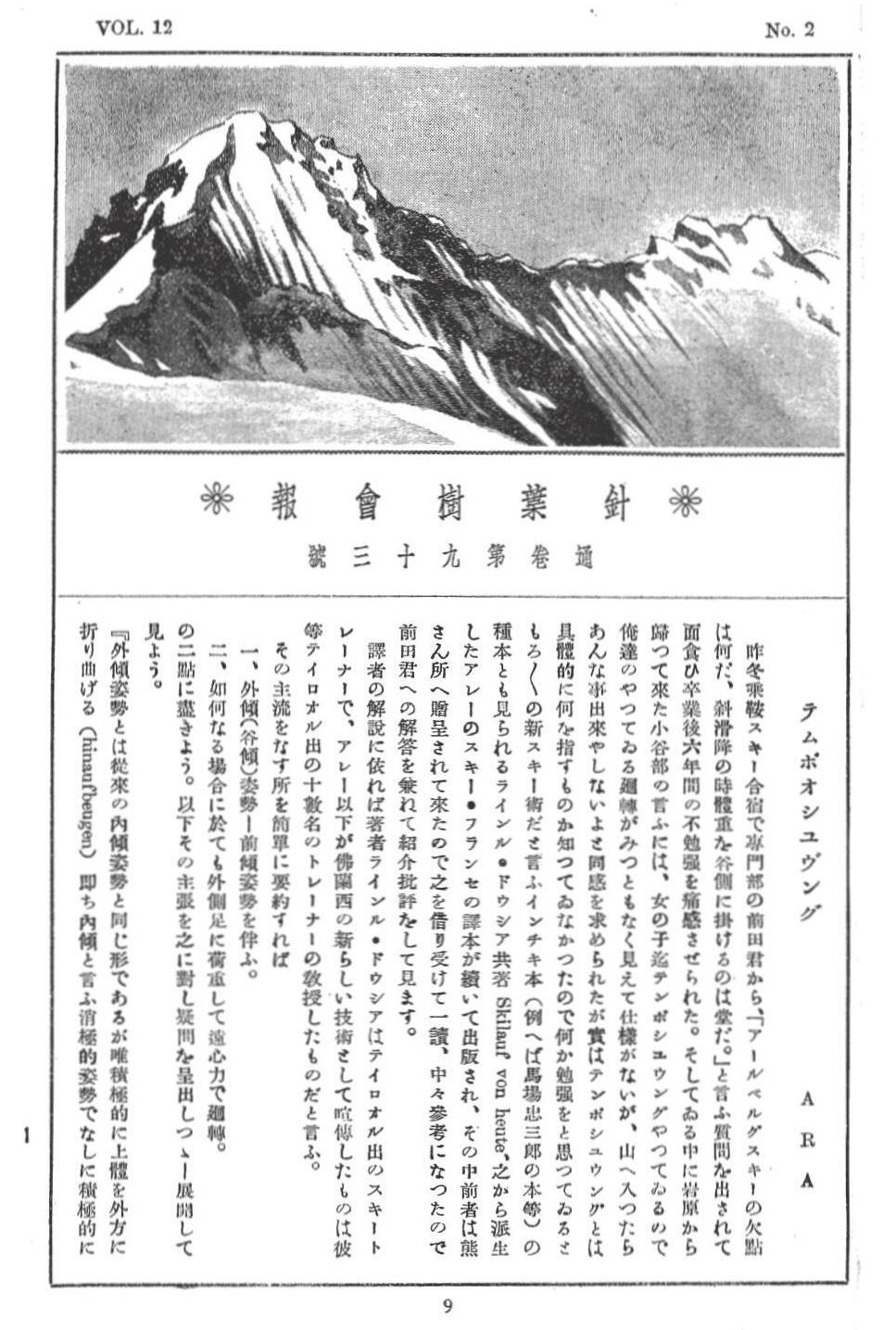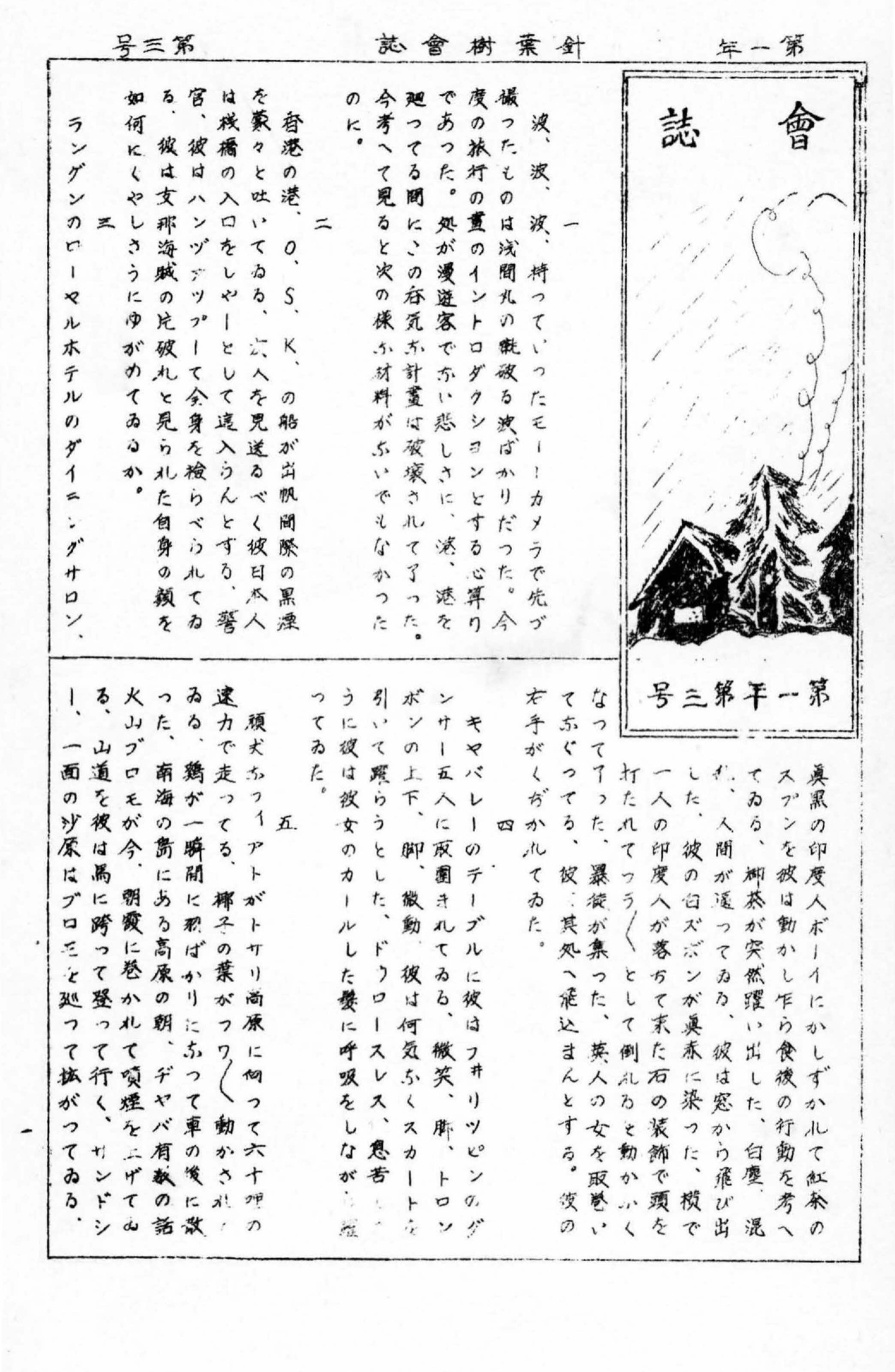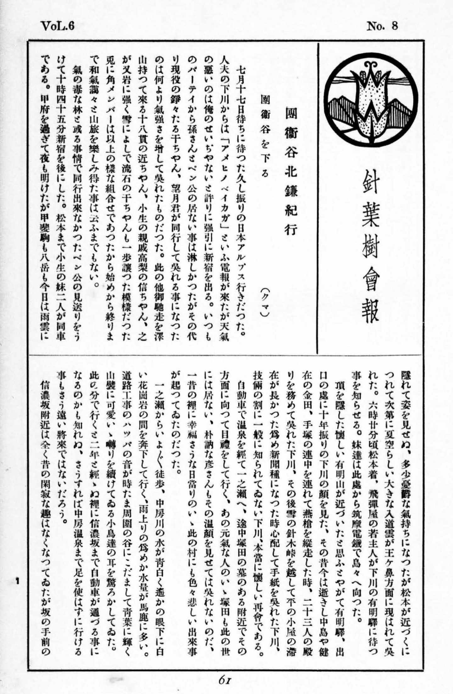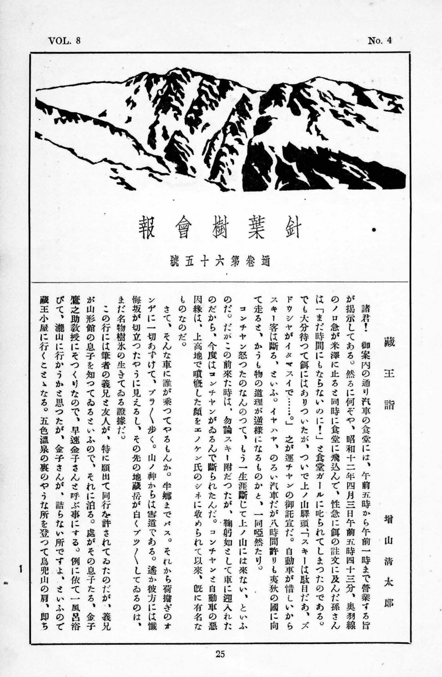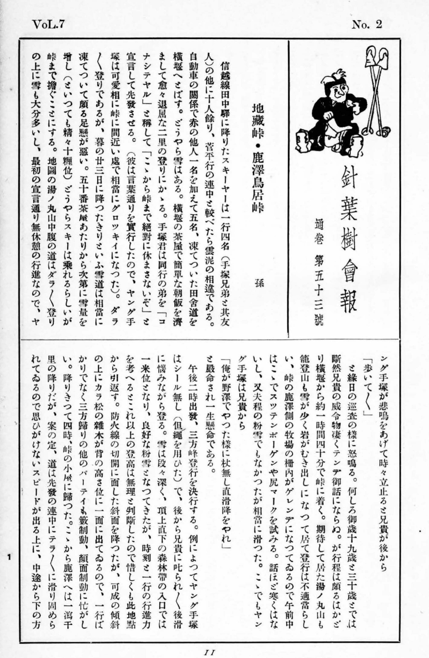 (前略)針葉樹会報がある。これは第1号を昭和5年に出している。つまり私達の グループが卒業して2年目から発行を始めていることになる。この頃は一橋山岳部と針葉樹会を切り離し、学校の山岳部員だった者が社会に出ると、自動的にOBグループの針葉樹会員になるということであったらしい。