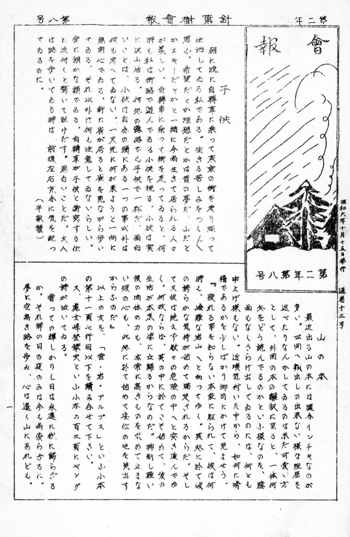 この会報には必ずしも山登りの記事だけではなく、会員の消息、短信、その時々の随想というものが載せられていったようで、会員以外の人が読んでもわからないし、少しもおもしろくないものである。しかしとに角く、われわれには大変懐しい印刷物であった。これも第6年第4号、つまり昭和10年5月に発行された第46号から活版刷となり、第13年2号(昭和17年10月発行)すなわち通巻99号まで、少なくともその形式で発行がつづけられていた。もっとも、世の中がその頃は大分騒々しくなり、物資も窮屈になってきたので、紙の質は多少悪くなっている。(後略)
